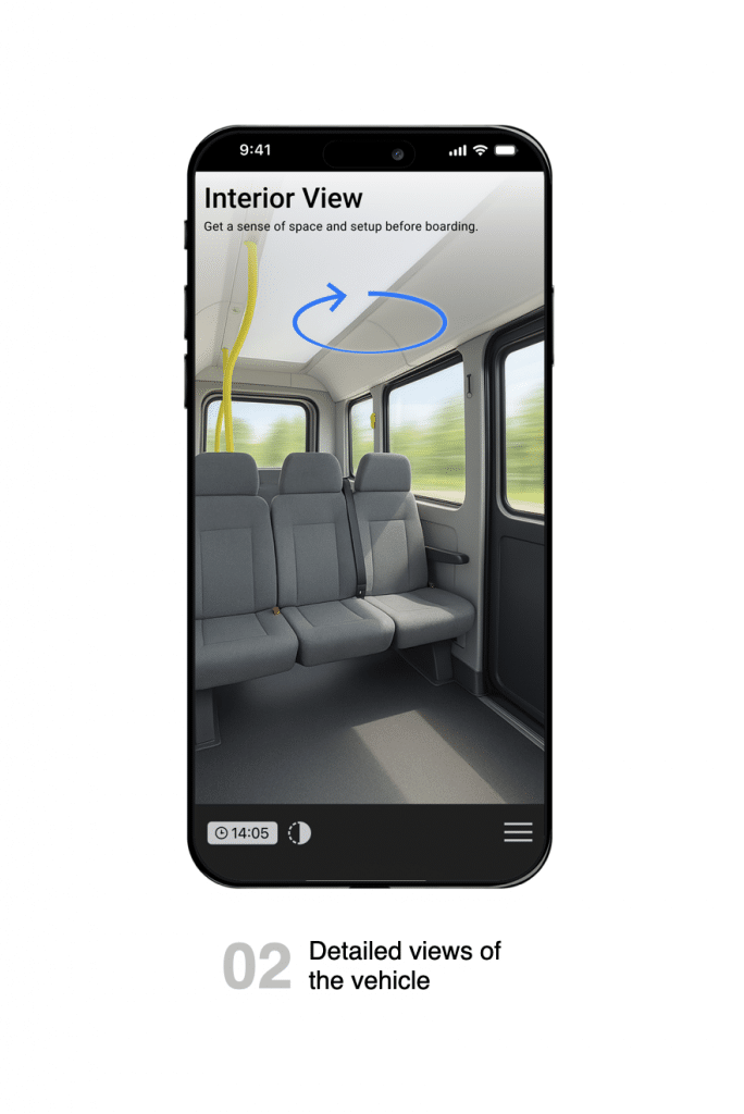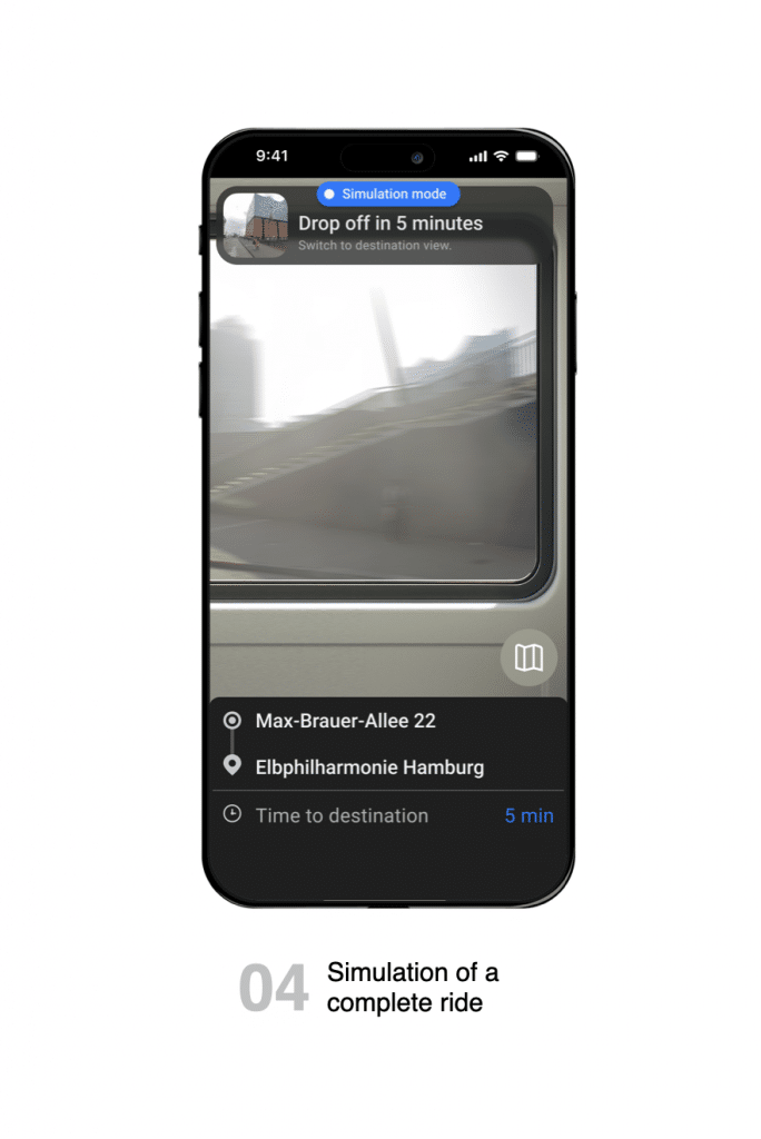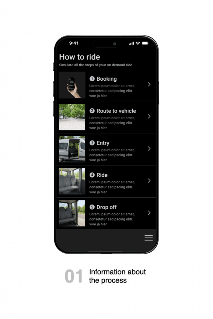 Ride Ready gibt den Nutzenden die Chance den gesamten Fahrtablauf bereits vor Nutzung zu durchlaufen. Angefangen bei der Buchung, mit den benötigten Parametern, über die Auswahl von ggf. Haltepunkten und der Simulation des Fahrzeuginnenraums bis hin zum Ausstieg. So wird eine größere Erwartbarkeit für die Umstände, die Umgebung und die Nutzung des Angebotes geschaffen.